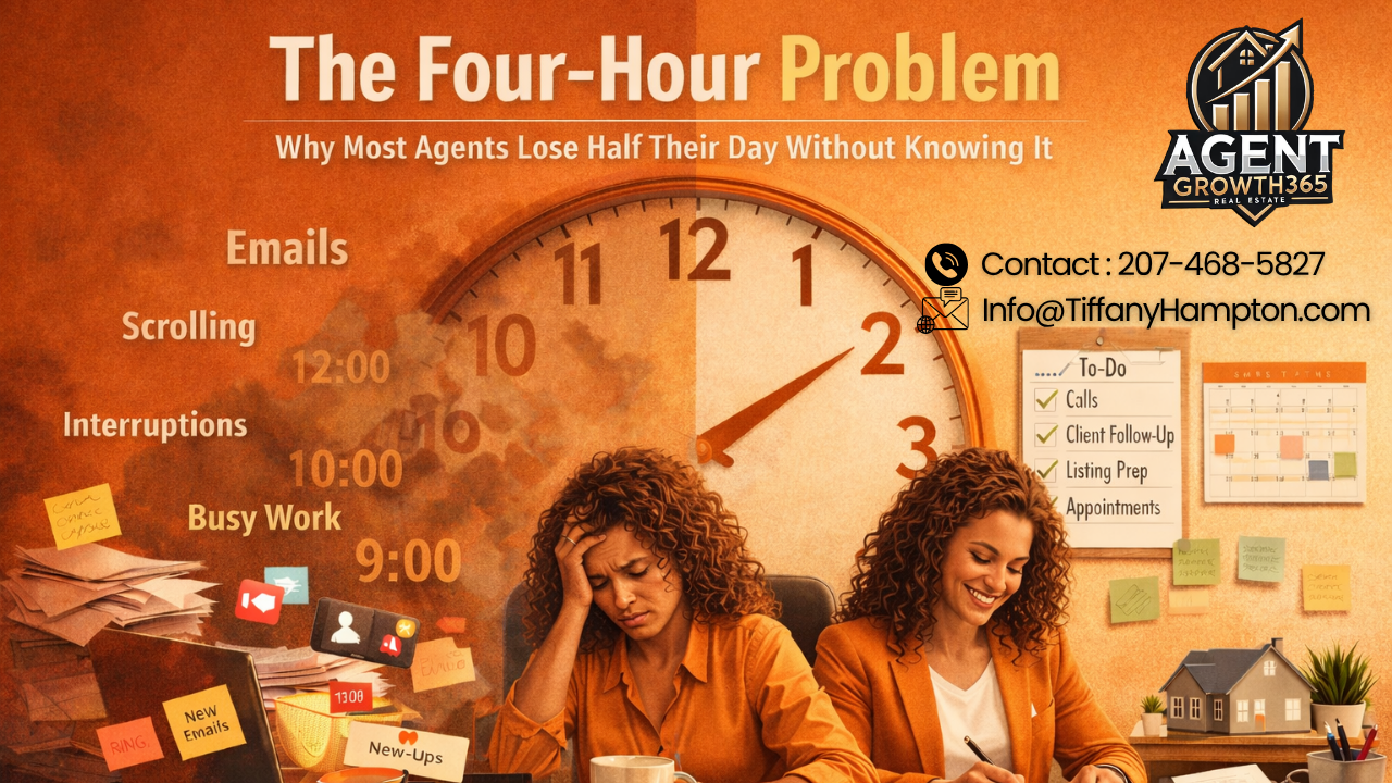 Coaching data consistently shows that the average agent loses four hours per day to reactive tasks. That is 20 hours per week. That is half a full-time job spent on things that do not generate income.